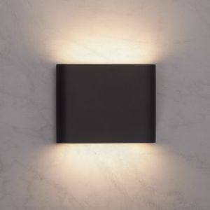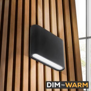 Deze zwarte aluminium dimbare led-wandlamp van 5 watt is direct aansluitbaar op 230 volt, bevat een up- en down light die dim-to-warm verlichting biedt en is IP65-straalwaterdicht.