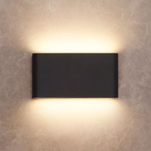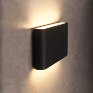Deze zwarte, XL aluminium led-wandlamp van 5 watt is direct aansluitbaar op 230 volt, bevat een up- en down light die dim-to-warm verlichting biedt en is IP65-straalwaterdicht.