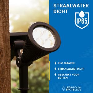 Deze op zonne-energie werkende prikspot is 120 graden kantelbaar, heeft 200 lumen en kan +/- 8uur mee op een volle batterij. En hij is IP65 dus ook geschikt voor buiten gebruik.
